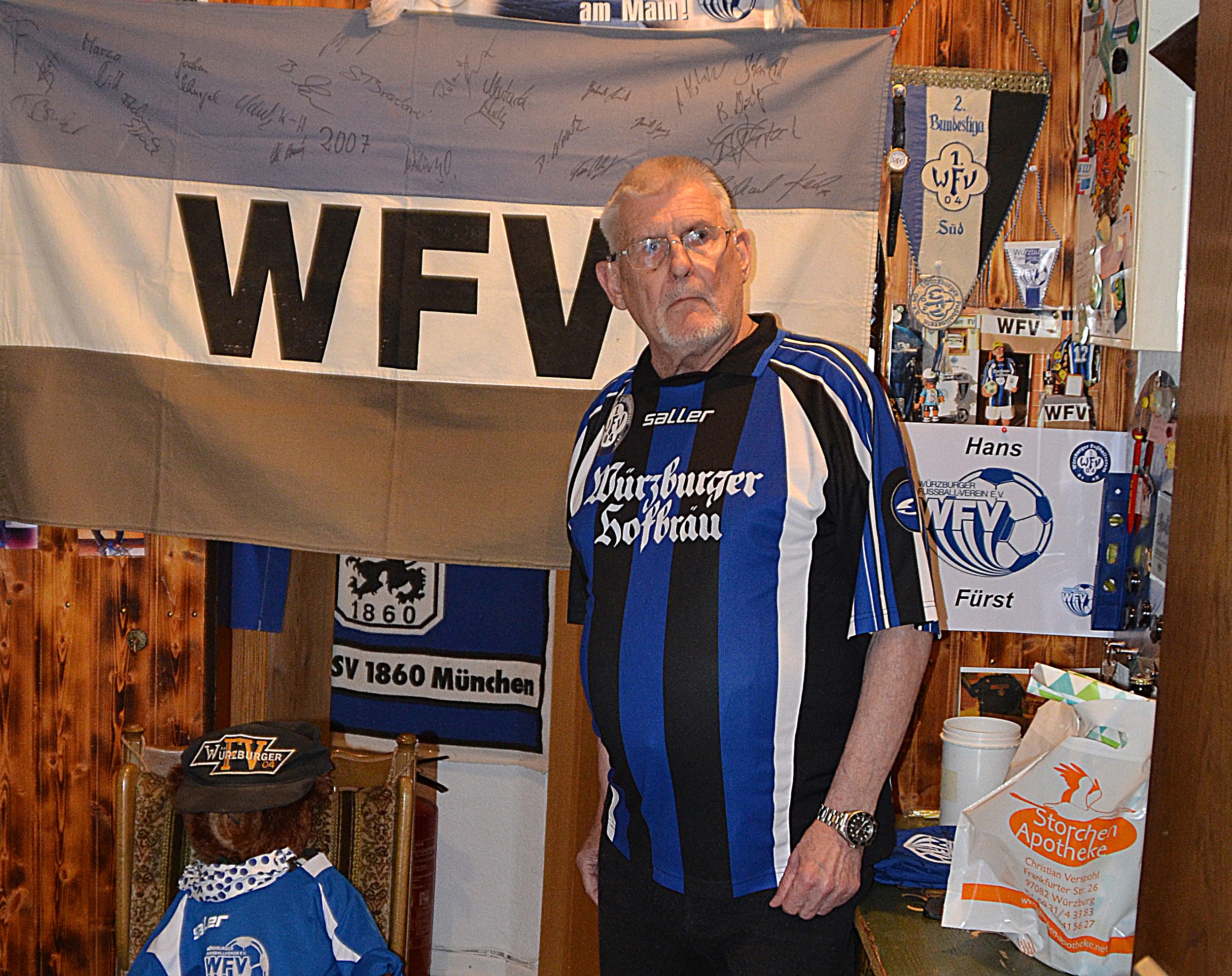 Immer hilfsbereit und unterstützungsfreudig hat er den Verein von der Seitenlinie aus begleitet, wenn auch in letzter Zeit immer seltener. Zu Hause sieht man schon gleich beim Betreten der Wohnung, wem Hans´ Herz gehört: seinem WFV 04. Gleichzeitig ist er aber auch ein Anhänger der Münchner Löwen, deren Devotionalien sich dann an den Wänden direkt hinter den WFV-Fahnen, Aufnähern, Urkunden und Kleidungsstücken finden, die Hans liebevoll und voller Stolz im Eingangsbereich präsentiert.