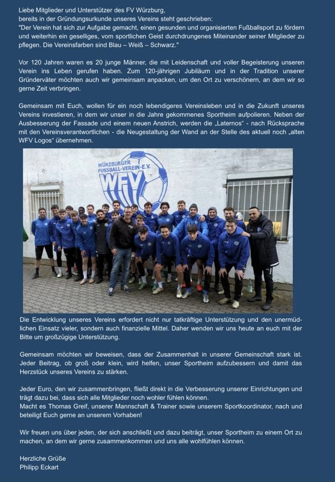 Meldet euch einfach unter dem Facebook Account “Würzburger FV Nullvierer Marketing” oder unter f.krapf@wuerzburgerfv.de oder direkt bei mir Persönlich.
