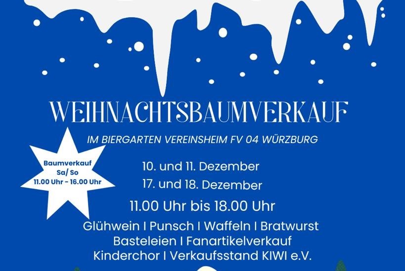 05. Dezember 2022Auch dieses Jahr kann man auf unserem FV 04 Gelände Weihnachtsbäume erwerben. Zudem haben wir in unserem Biergarten, wie auch die letzten Jahre, einen kleinen Weihnachtsmarkt aufgebaut. Neben Glühwein, Punsch, Waffeln und Bratwurst ist auch unser Fanshop vor Ort. Der karitative Charakter, der für viele an Weihnachten dazu gehört, kommt auch nicht zu kurz. So ist ein Stand von KIWI e. V. zu Gast, mit deren Einnahmen die Kinderintensivstation der Universitätsklinik Würzburg unterstützt wird. Des Weiteren singt der Zellerauer Kinderchor und macht die vorweihnachtliche Stimmung perfekt.