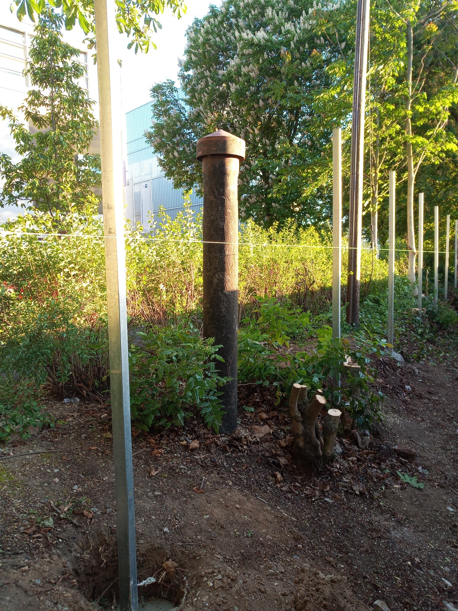 29. Juni 2020Beim Abriss des alten Zauns oberhalb der Umkleiden des ehemaligen SV 09 kam eine Art Schlot zum Vorschein. Es scheint ein Abzug (zum Vergrößern Bild anklicken) zu sein. Aber für was?